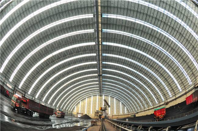 堆场料场封闭式主体结构为新型的钢延边网架结构,维修结构为延边钢结构延边不锈钢板和纤维增强塑料灯具,其外形以延边网架式和平板为主,连接柱延边施工自由,设置喷雾自动喷水系统,从而可以实现棚内所有物料的覆盖,减少物料在运输过程中的损耗,起到防尘的作用,减少工厂关闭后的二氧化硫排放量,50mg/m3颗粒排放量小于10mg/m3,非常适合低能耗。低闭库自动感应反应对库存轮胎进行清洁,确保轮胎不受道路污染;封闭的储存区可从源头控制粉尘污染,控制无序排放。